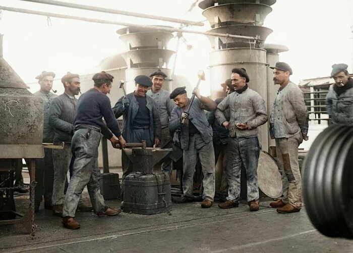 Смотришь на этот снимок — и сразу чувствуешь запах соленого ветра и машинного масла. Настоящие морские волки конца XIX века собрались вокруг корабельной кузницы прямо на палубе.