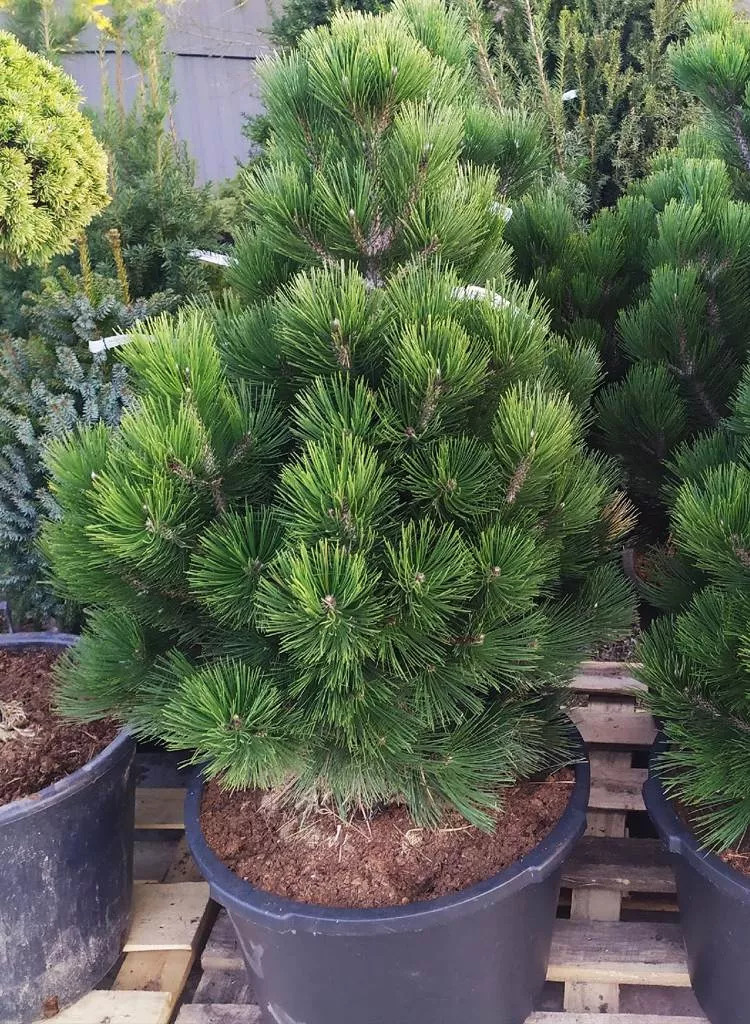 Этот сорт относится к средневысотным деревьям, достигающим максимальной высоты около 6 метров и ширины кроны примерно 3 метра. Однако рост сосны достаточно замедленный: в десятилетнем возрасте её высота составляет лишь около полутора метров, а ширина кроны — чуть меньше одного метра. Крона имеет красивую пирамидальную форму, ветви расположены вертикально вверх, формируя аккуратную густую структуру. Хвоя ярко выраженного тёмно-зелёного цвета, блестящая, жёсткая и колючая, растёт небольшими пучками по два листа в каждом. Длина иголок колеблется между 6–7 сантиметрами. Шишки отличаются формой и цветом: они овальные, длиной до 8 сантиметров, голубые пока ещё не созрели,