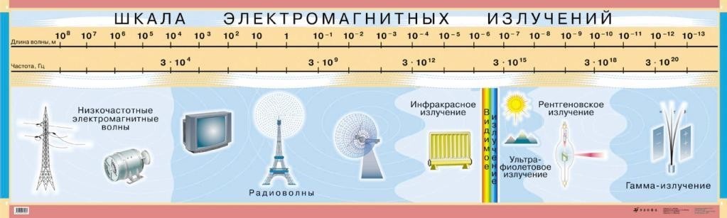 Для электромагнитных волн есть целая шкала длин волн. Она показывает длину волны и частоту для разных типов электромагнитных волн.