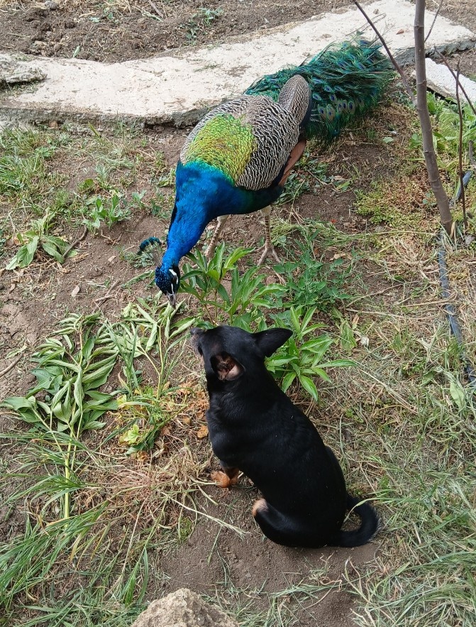 Отношения Боя и остальных домочадцев. Все наши животные прекрасно знают друг друга, даже сидящий на цепи Лоп. Потому что птицы бродя по саду доходят и до его территории. Персик к павлинам не суётся. Не знаю какие отношения у них в моё отсутствие, но когда я иду кормить птиц кот предпочитает находиться рядом. Мало ли. Вдруг что и перепадёт. Павлины сами по себе птицы неспешные, не суетливые как куры, любопытные. Всё и всех внимательно разглядывают. И очень нравится им любоваться на себя в зеркало. Вот и кота Бой разглядывает так, как будто раньше не видел. Это Бой летний, ещё с неосыпавшимся хвостом. Это он перелетел через сетку к соседям и не знал как вернуться обратно. Муж ходил его забирать. Вообще такое бывает редко но случается. Потому что павлины любят ночевать на деревьях, на какой нибудь высоте, и иногда получается у него взмыть в небо аки сокол...а полёта хватает как индюку - метров так на ... как раз к соседям в огород. В общем, подрезали мы им по одному крылу. На крыше б