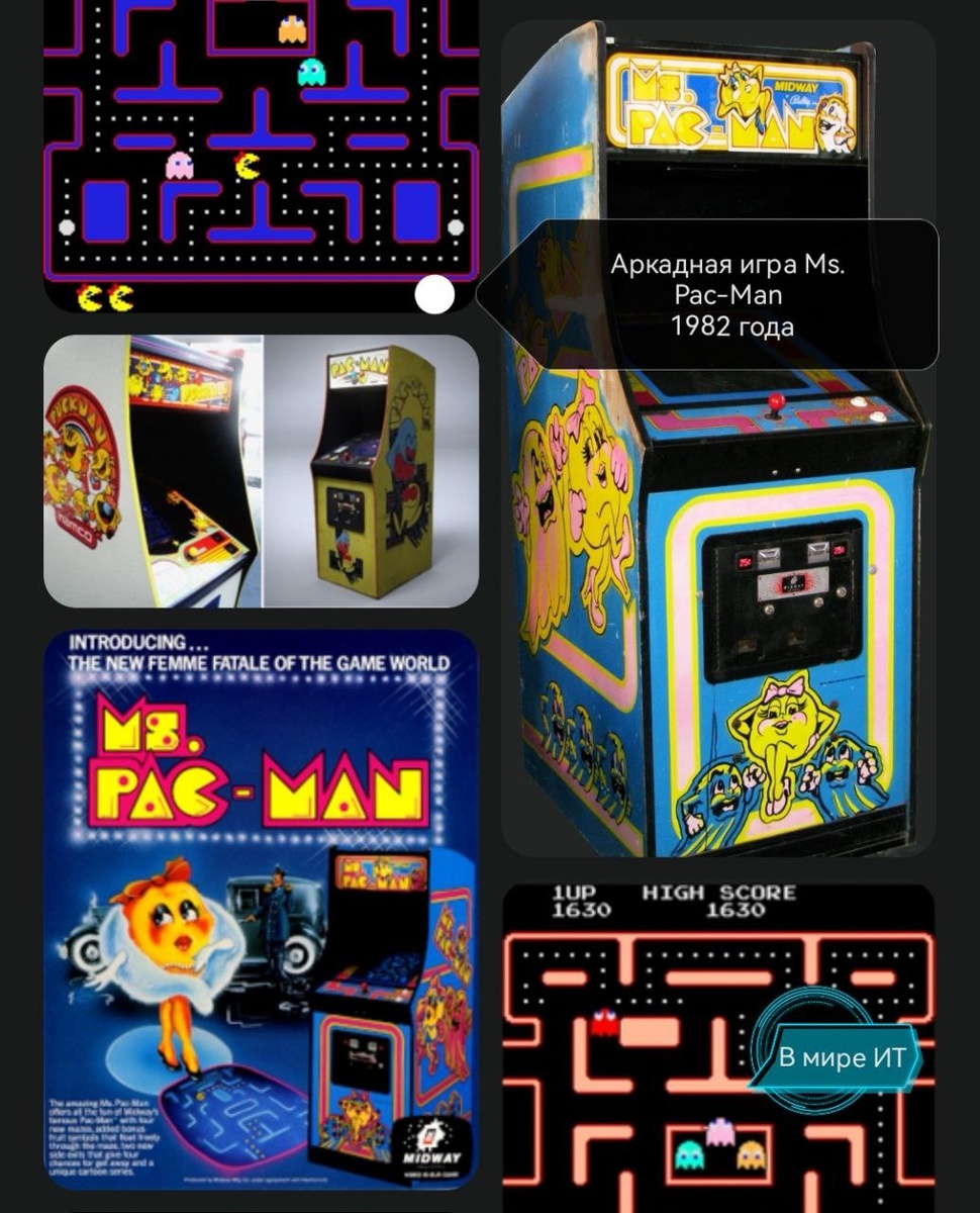 Ms. Pac-Man, аркадная игра 1982 года, продолжение культовой игры Pac-Man. Главная героиня - женская версия Пакмана, которой игрок управляет, проходя лабиринты, поедая точки и уворачиваясь от призраков-преследователей. В игре появились новые лабиринты, более сложные маршруты призраков и дополнительные бонусы, более разнообразный геймплей.