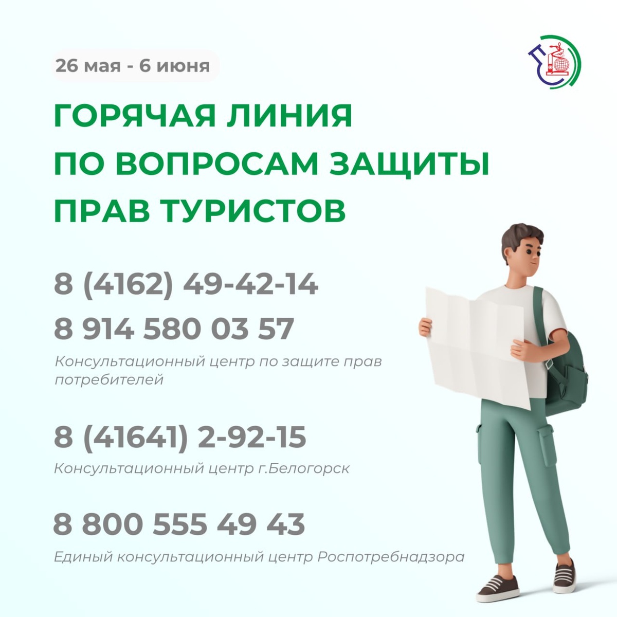 Открыта Всероссийская горячая линия, посвященная вопросам защиты прав потребителей в сфере туристических услуг🧳 С 26 мая по 6 июня специалисты Роспотребнадзора и Консультационного центра ФБУЗ «Центр гигиены и эпидемиологии в Амурской области» готовы проконсультировать амурчан по широкому спектру вопросов, связанных с покупкой туристических путевок, оказанием услуг в гостиницах, правами туристов Кроме того, будут даны рекомендации по пребыванию в жаркую погоду, безопасному питанию, качеству питьевой воды, правилам купания и необходимым прививкам для путешествий 💭Телефон горячей линии Управления 8(4162)49-49-80 💭Консультационный центр по защите прав потребителей (Центр гигиены и эпидемиологии в Амурской области) г. Благовещенск, ул. Первомайская, 30 8(4162)49-42-14 +7 914 580-03-57 💭Консультационный пункт по защите прав потребителей в г. Белогорск ул. Красноармейская, 15 8(41641)2-92-15 На федеральном уровне в круглосуточном режиме функционирует Единый консультационный центр Ро