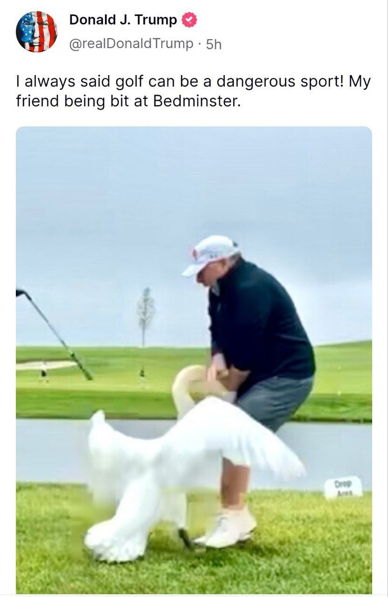 Стива Уиткоффа покусал гусь. Дональд Трамп опубликовал фото, где заявил, что его друга во время гольфа атаковал гусь. Судя по фотографии, жертвой птицы стал Уиткофф, который занимается у Трампа переговорами с Россией. А гусь, который укусил его за то самое место, явно работает на Кремль