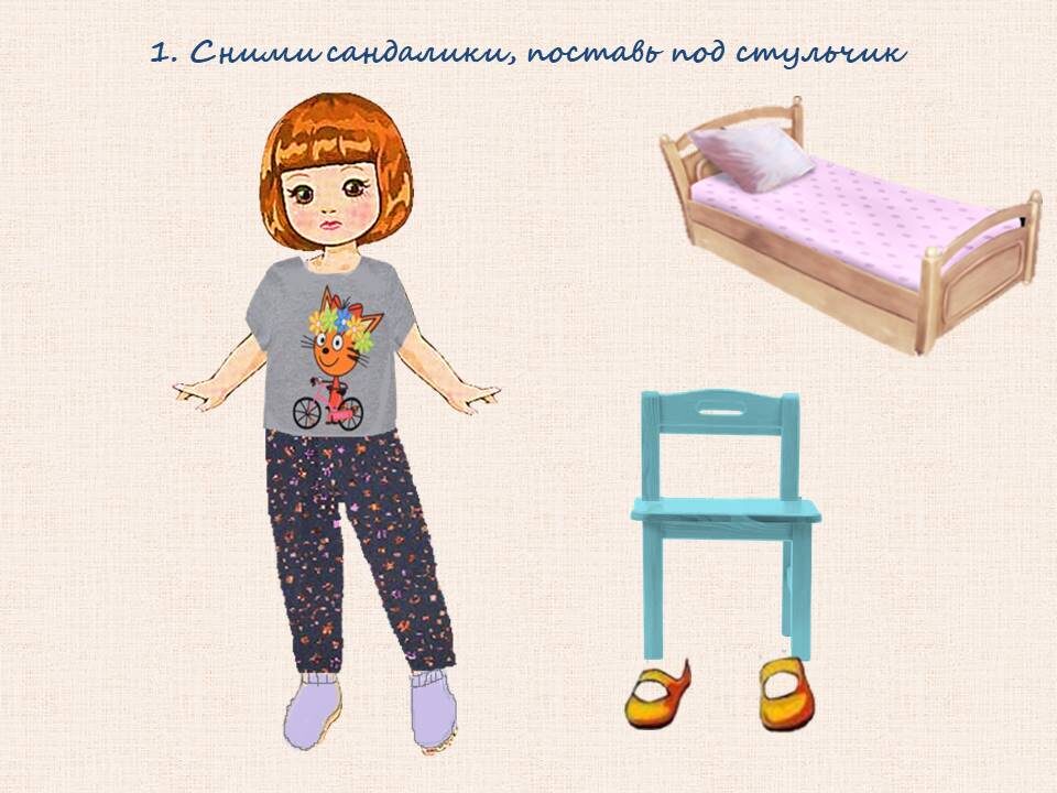 Одевание и раздевание – это сложные процессы для малыша. Очень часто дети путают, что и за чем нужно надевать или снимать. Они могут сначала надеть сандалики, и уже надев их вспомнить, что надо было до этого надеть штаны. Поэтому важно научить ребенка соблюдать последовательность в одевании или раздевании одежды. Чтобы малыш не путался, я сделала алгоритм «Раздевание перед сном». Малыши, которые живут только третий год жизни, с радостью делают то, что делают окружающие его взрослые. Поэтому, обучая малышей раздеваться и одеваться в правильной последовательности, важно, чтобы взрослые, одевая или раздевая детей, соблюдали ту последовательность, которой мы обучаем малышей в садике.