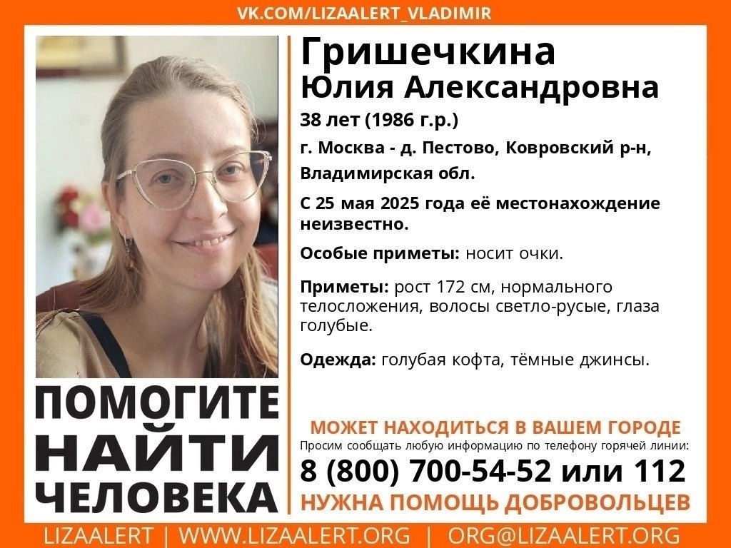 #Внимание! Помогите найти человека! #Максимальный_репост Пропала Гришечкина Юлия Александровна 1986 г.р. (38 лет), г. Москва - д. Пестово, Ковровский р-н, Владимирская обл. С 25 мая 2025 года её местонахождение неизвестно. Может находиться в вашем городе! Особые приметы: носит очки. Приметы: рост 172 см, нормального телосложения, волосы светло-русые, глаза голубые. Была одета: голубая кофта, тёмные джинсы. Инфорги: Таврида (Яна) 89991217264, Чип (Александра) 89036488575 Тема на форуме: clck.ru/3MGRt5 #Владимирская #Ковровский #ЛизаАлертВладимирскаяобласть #lizaalert_33 #Пропал_человек #Поиск #помощь #Помогите_найти