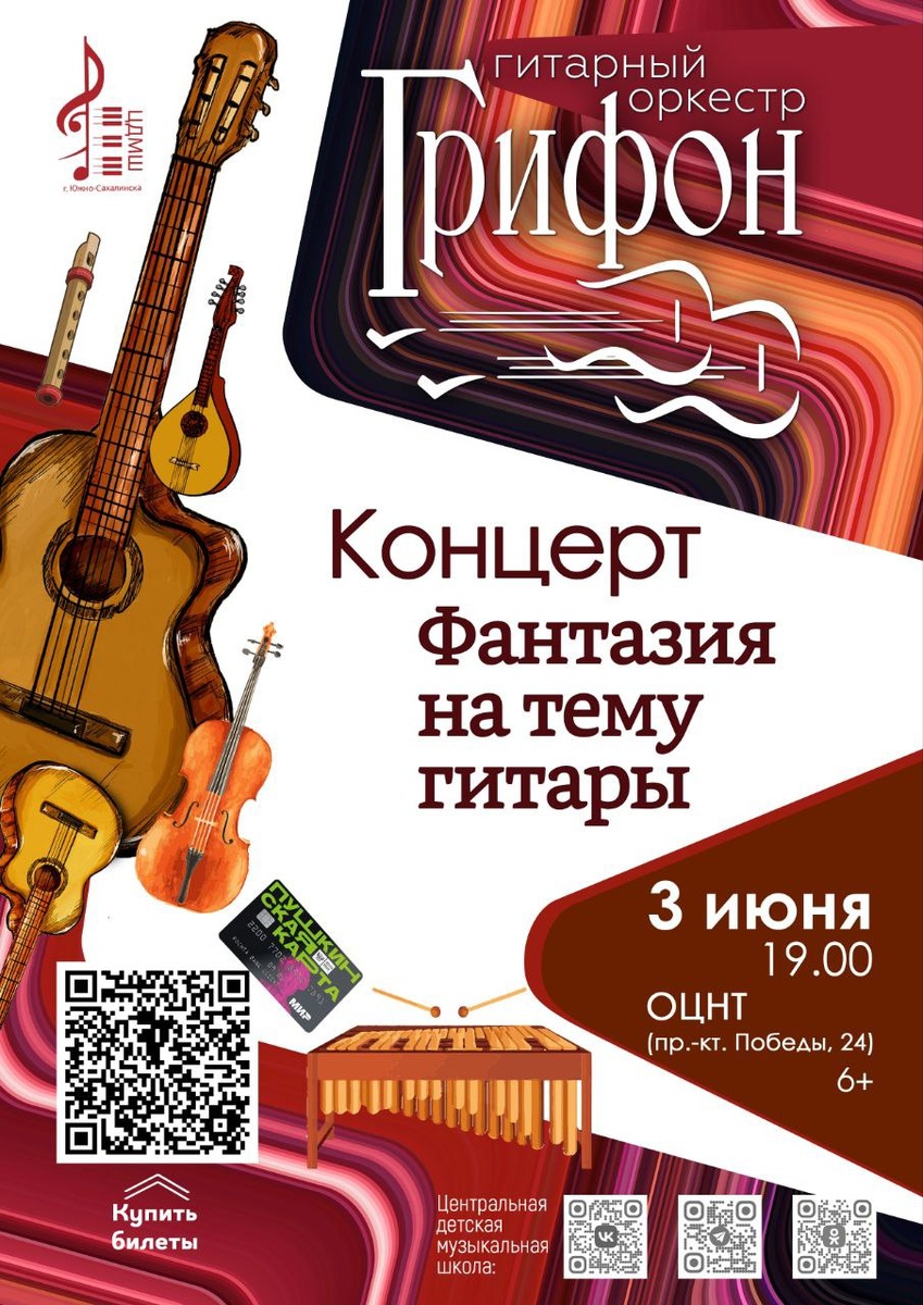 🐦🔥 Уникальный островной коллектив Гитарный оркестр "Грифон" приглашает на концерт «Фантазия на тему гитары». 🌒 Зрителей ожидает проникновенное эстетическое переживание. Смелая и неординарная оркестровая форма гитарного искусства, в сочетании с эмоциональной глубиной академической манеры исполнения, объединит музыкантов и слушателей в чувственной истории, которая зарождается в сердце и воплощается в звуке. 🎼 В программе: классическая музыка, русская и ирландская народная музыка, саундтреки из кинофильмов, компьютерных игр и многое другое. 📍Ждём вас 3 июня в 19:00 в Областном центре народного творчества (пр.-кт. Победы, 24). 🎫 Билеты: https://cultsakhalin.ru/events/18836/koncert-fantaziya-na-temu-gitary Участвует в программе Пушкинская карта. @cdmshsakhalin|#афишаЦДМШ