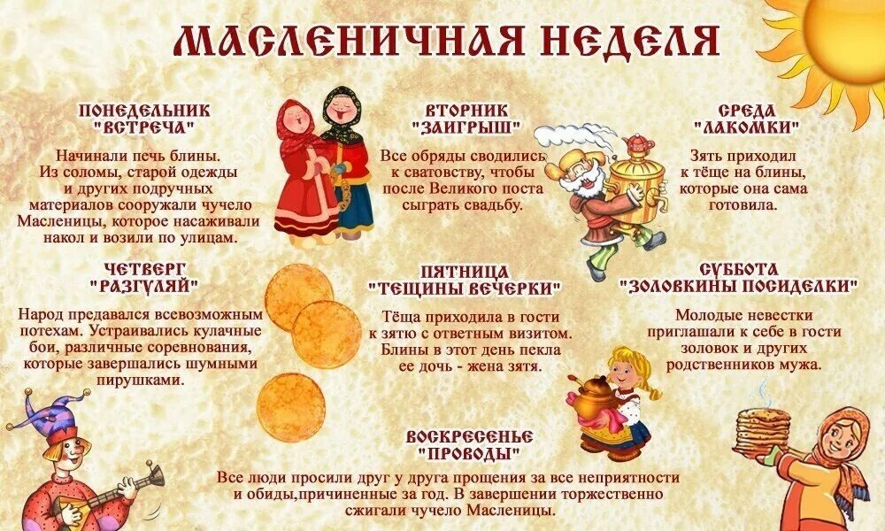 Масленичная неделя состоит из семи дней, каждый из которых носит своё особое название и наполнен особыми традициями и обрядами. Вот подробное описание каждого дня масленичной недели: