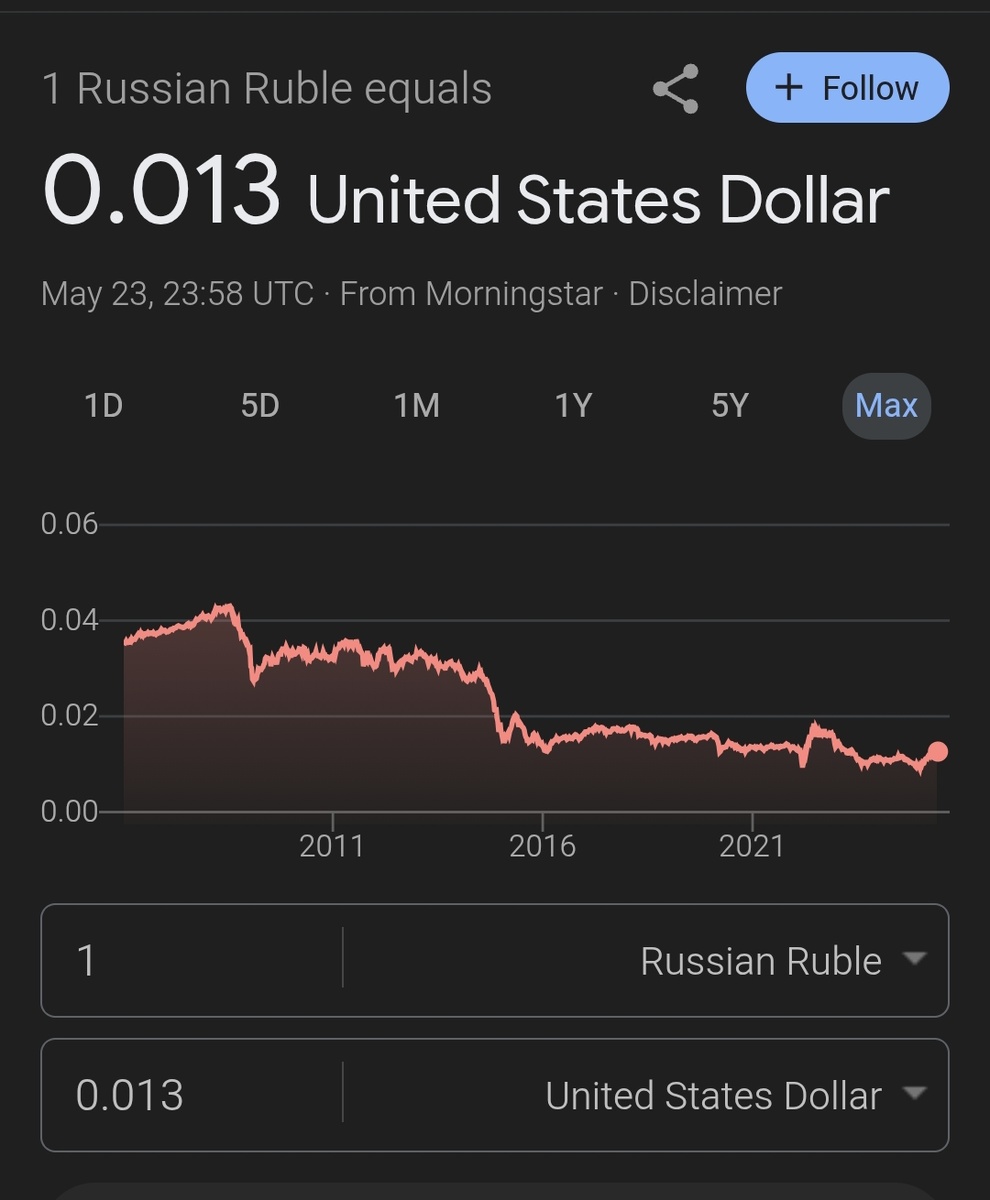 Про деньги давно не было общения. В прошлый раз сбылись мои предсказания по поводу Трампа-президента, сбылись предсказания по поводу падения нефти, но что же по поводу последствий для сырьевых держав? Ссылка на доказательства про сбывшиеся предсказания : Рубль на 80 за доллар, что феноменально, учитывая то, что и 10 лет назад он был там же, хотя цены на всё в рублях отреагировали оперативно и без всякого доллара. Таким образом, то, насколько цены в рублях сейчас больше по сравнению с 10 лет назад, отражают насколько дороже должен стоить доллар. Есть ещё своя рублевая инфляция в связи с печатанием денег, а этим, очевидно, плотно занимаются с 2022 года. Далее под словом "доллар" я буду понимать любой валютный финансовый инструмент. Торгуя сейчас на российской бирже важно понимать, что, как говорилось в одном известном фильме: Всё уже украдено до нас. И помнить великую фразу побитого жизнью человека из другого фильма: Нашёл фраера с тобой играть, у тебя в колоде 9 тузов. Обе э