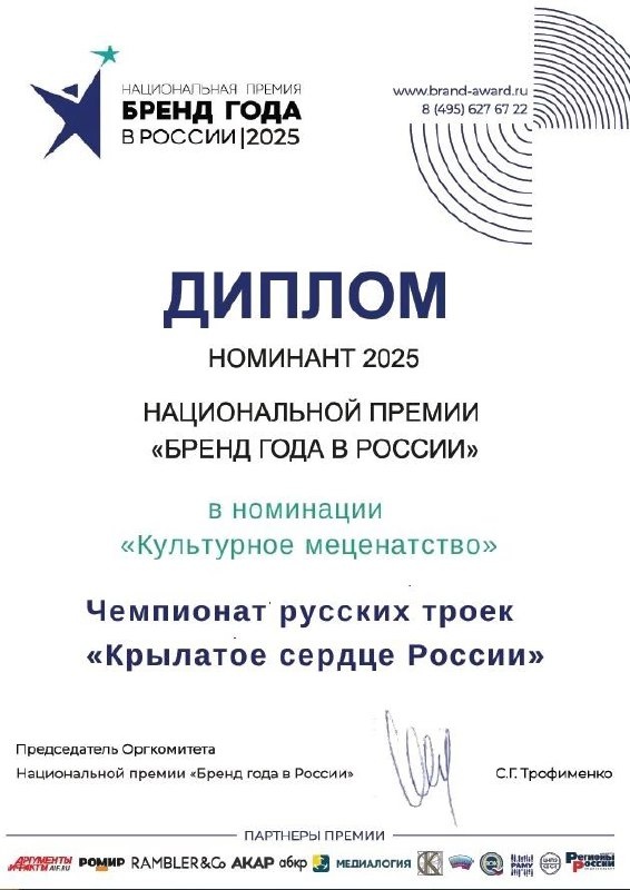 Бренд Чемпионата русских троек « Крылатое сердце России » вошел в состав первого шорт-листа номинантов премии «Бренд года в России!» Оргкомитет III Национальной премии «Бренд года в России 2025» подвел результаты 1-го этапа рассмотрения конкурсных заявок. Претендентами на победу объявлены 60 отечественных брендов. Чемпионат русских троек «Крылатое сердце России», который в 2025 году пройдет в пятый раз на Московском конном заводе №1 , выбран в номинации "Культурное меценатство" Организаторы "Крылатого сердца России" : ПАО "Акрон", Московский конный завод №1 , Ассоциация «Росплемконзавод» , Общество любителей экипажной езды #МКЗ1 #тройка #чемпионатрусскихтроек #КрылатоеСердцеРоссии #БрендгодавРоссии