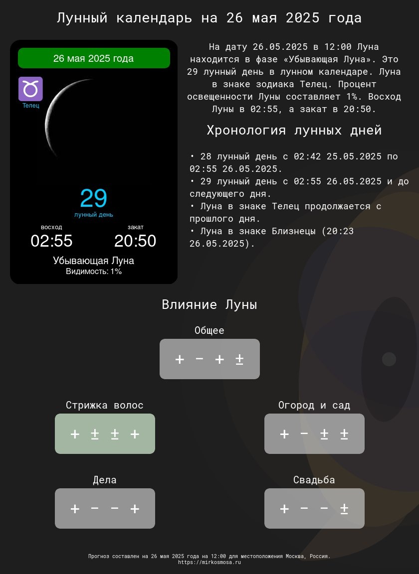 Лунные календари на 26 мая 2025 года: Подготовьтесь к этому дню с учетом влияния Луны! 🔹🌗 Лунный календарь на 26 мая 2025 года — Что приготовила Луна? Подробнее 🔹✂️ Лунный календарь стрижек на 26 мая 2025 года — Подходящий ли день для обновления прически? Подробнее 🔹🌱 Лунный календарь огородника и садовода на 26 мая 2025 года — Лучшее время для ухода за растениями. Подробнее 🔹📅 Лунный календарь дел на 26 мая 2025 года — Удачные моменты для важных задач. Подробнее 🔹💍 Лунный календарь свадеб на 26 мая 2025 года — Подходит ли этот день для вашего торжества? Подробнее