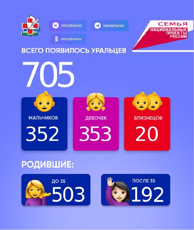 Радостной статистики пост! За прошедшую неделю в Свердловской области появились на свет 705 малышей: 💙352 мальчика и 353 девочки💖, из них 10 пар близнецов. 503 мамы родили до 35 лет. 192 мамочки родили после 35 лет. 👨👩👧👦 Для двух свердловчанок это были восьмые по счету роды, а 17 новорожденных стали пятыми детьми у своих мам.🏅 Поздравляем! 📱Подписаться, чтобы узнать больше