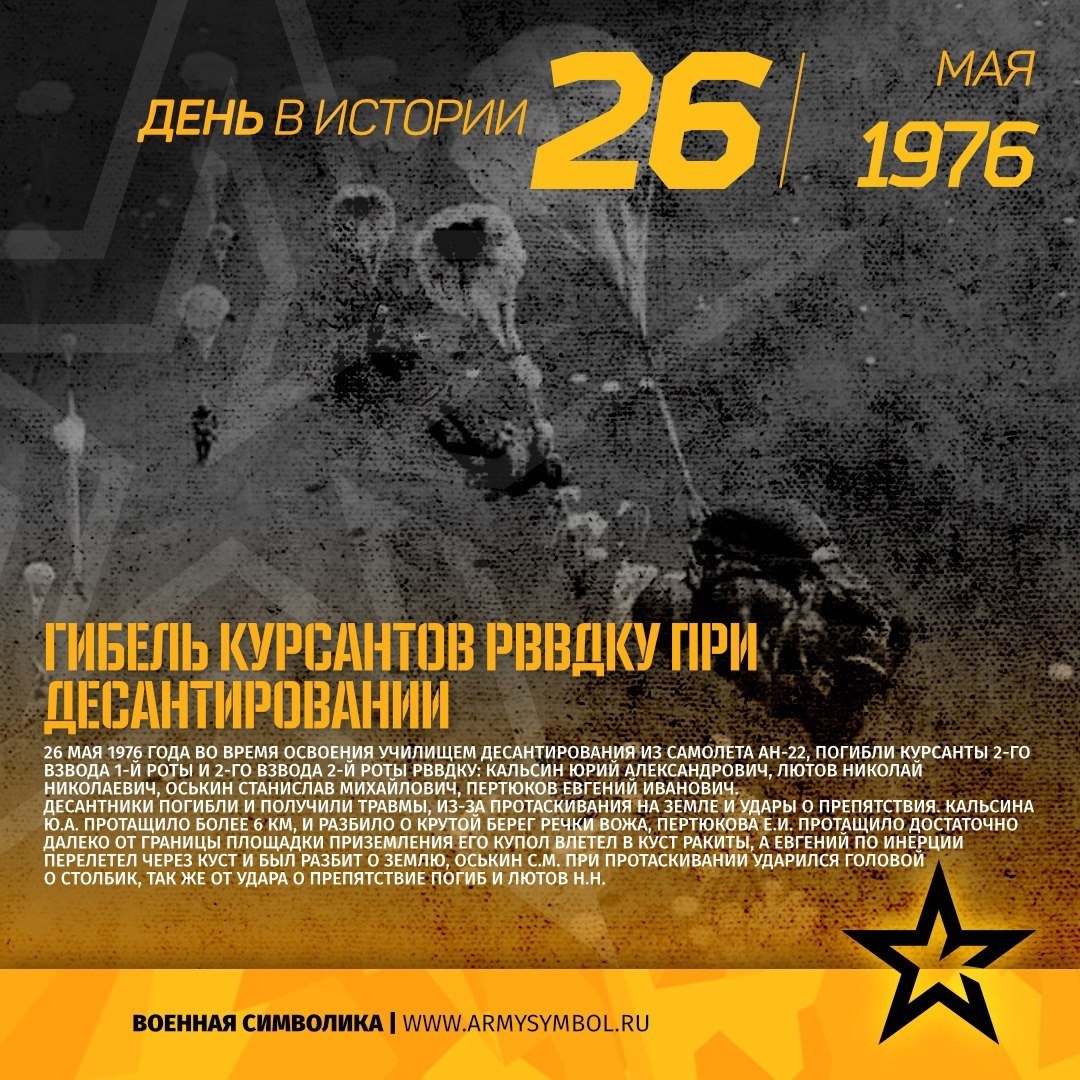 Гибель курсантов рввдку при десантировании в 1976 26 мая 1976 года во время освоения училищем десантирования из самолета АН-22, погибли курсанты 2-го взвода 1-й роты и 2-го взвода 2-й роты РВВДКУ: ⁃ Кальсин Юрий Александрович, ⁃ Лютов Николай Николаевич, ⁃ Оськин Станислав Михайлович, ⁃ Пертюков Евгений Иванович. Десантники погибли и получили травмы, из-за протаскивания на земле и удары о препятствия. Кальсина Ю.А. протащило более 6 км, и разбило о крутой берег речки Вожа, Пертюкова Е.И. протащило достаточно далеко от границы площадки приземления его купол влетел в куст ракиты, а Евгений по инерции перелетел через куст и был разбит о землю, Оськин С.М. при протаскивании ударился головой о столбик, так же от удара о препятствие погиб и Лютов Н.Н. #ПамятныеДатыВоеннойИсторииОтечества #ДеньВИстории #ГодЗащитникаОтечества #80ЛетВеликойПобеды Источник: https://vk.com/wall-60767131_30737 Подпишитесь на наши группы ВКонтакте и в Одноклассниках - читайте, смотрите и комментируйте! Источ