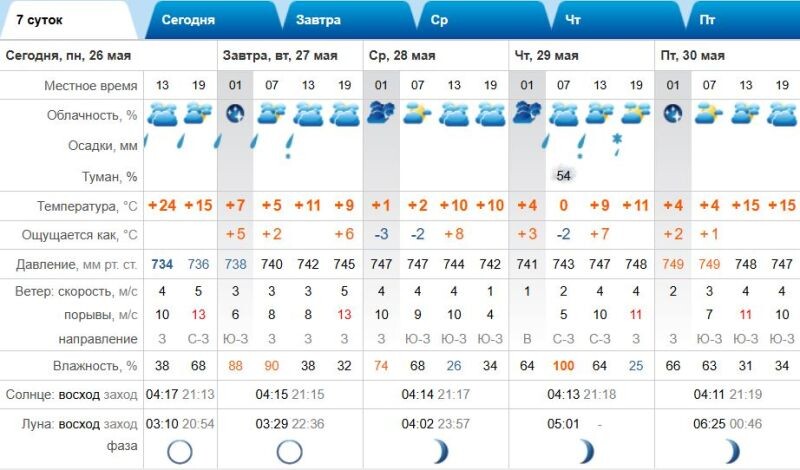 Сегодня, 26 мая, днём пасмурно, возможен дождь, но ещё тепло и +24, ветер северо-западный 5-13 м/с. Во вторник уже похолодает - ночью +7, днём не выше +11, пасмурно и дождь со снегом, ветер западный 5-13 м/с.