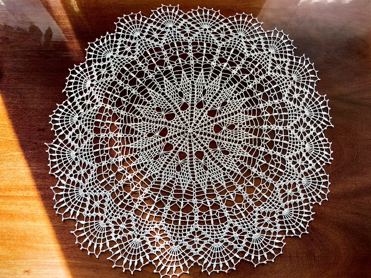 В итоге у меня ушло на эту салфетку 77 граммов (хотя у автора всего 53 грамма). Почему так получилось я понятия не имею, возможно автор вязала поплотнее, чем я. В пользу этой версии говорит и тот факт, что салфетка у меня получилась в диаметре 66 см в отличии от 49 см у автора. И вот для такого размера мне оказалось довольно сложно провести ВТО. Обычно я натягиваю свои готовые вязаные крючком изделия на куске утеплителя из какого-то пенопласта (не помню, как он правильно называется - Пеноплекс, кажется) и закрепляю булавками. А тут этот мой пеноплекс оказался маловат для такого диаметра и пришлось использовать большую подушку "по старинке".