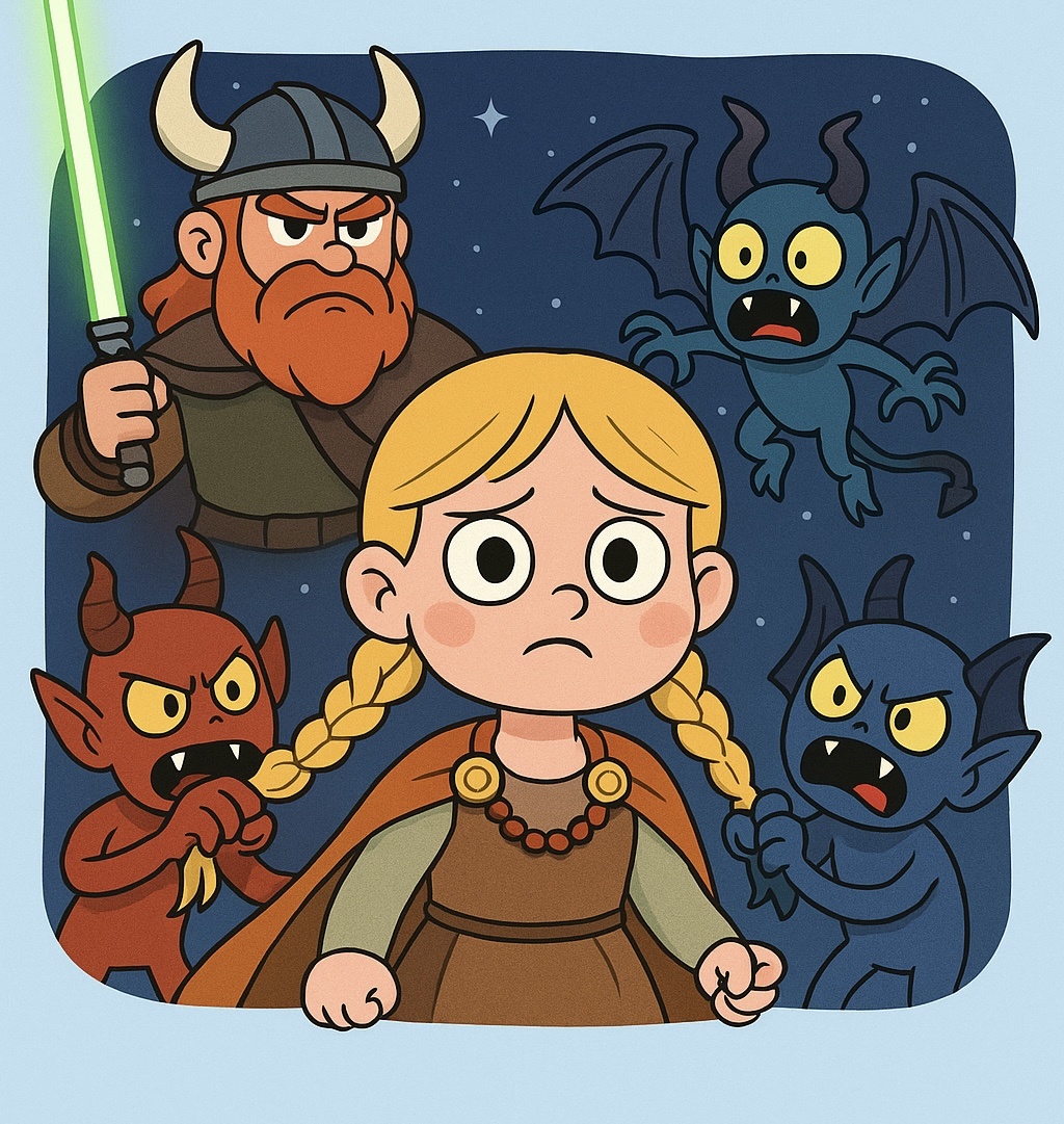 Давным-давно, в скандинавской деревушке на краю соснового леса, жила девочка по имени Ингрид. Ей было двенадцать, она умела метко плеваться в лужи, разговаривать с воробьями и варить суп из мха и тумана. Её отец, могучий викинг по имени Торстейн Молниекрушитель, однажды попал в бурю настолько сильную, что вместо того, чтобы утонуть, он случайно пробил ткань времени и оказался в другой галактике — прямо посреди совета джедаев. Там его научили использовать Силу, а заодно как не жечь бороду световым мечом. Он стал первым викингом-джедаем в истории Вселенной и получил титул Торстейн Бессмысленно-Мудрый. Пока он парил в гиперпространстве, Ингрид училась играть на льдинах, гонять полярных кур и дружить с ёлками. Но в день, когда ей исполнилось 12, небо треснуло, и оттуда вывалились демоны — один с глазами как варёные яйца, другой с хвостом, который говорил по-французски, а третий вообще был сделан из гвоздей. — Пора в Абсурдонию! — завизжали демоны и утащили Ингрид в своё измерение, где кот