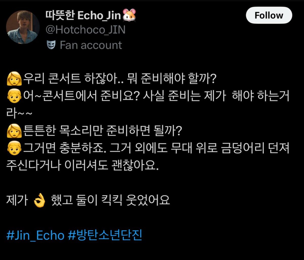 Джин: Эээ~ подготовиться к концерту? На самом деле подготовка — это то, что должен делать я~~
