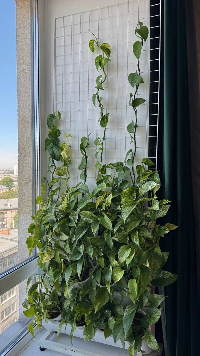 Помните видео про доработку филомодуля? А вот и результат, спустя почти полтора месяца🌿 Даже на прямом солнце никто не засох и не подгорел. Эпипремнумы выдают крупные и яркие листья 🌱 Тут у меня два вида: - марбл квин и - золотистый Длинные плети срежу, чтоб не выбивались из общей массы. Такими темпами к концу лета вся решетка будет заполнена зеленью 😍 Yu_jungle 🌱