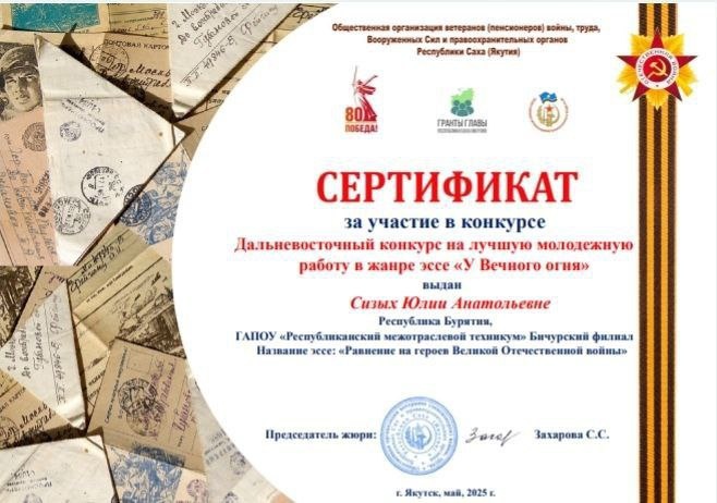 Общественная организация ветеранов войны, труда, Вооруженных Сил и правоохранительных органов Республики Саха (Якутия) вручила награду студентке 1 курса Бичурского филиала Сизых Юлии за её активное участие в Дальневосточном конкурсе на лучшую молодёжную работу в жанре эссе «У вечного огня». 🎓💫 Мы гордимся твоим достижением, Юлия!👍👏 #СПО_БУРЯТИИ #Эссе #Вдохновение #Будущее #БичурскийФилиал
