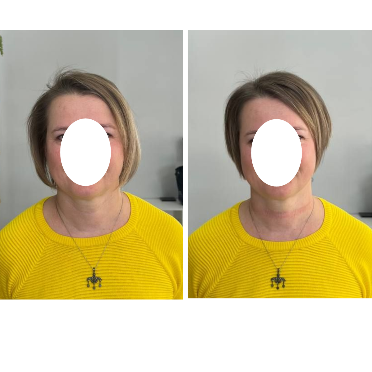 На фото- Анна. Стрижка «до» тоже моя, ей полгода. Особенность волос: тонкие и прямые. Можно ли вообще создать объем на таких тонких волосах? За счет домашней укладки- нет. За счет формы- отчасти, в том случае, если волосы достаточно короткие. Мы не стремились создавать какие-то объемы специально, просто Анне надоела предыдущая длина, и она захотела что-то покороче. В помощь стрижке можно использовать средства для объема. Напоминаю, что они не могут создать нечто очень пышное и тем более приподнять корни. Однако, каждый волосок немного увеличится в диаметре, а также снимется излишняя подвижность и рассыпчатость волос. В случае с Анной мы использовали классическую пену-спрей для объема. Если вы не любите ощущение укладочного средства на коже головы, могу рекомендовать легкие спреи, которые распыляются не как пенка, а как жидкость. Ими можно сбрызнуть длину, отступив от корней. Такие спреи разглаживают и уплотняют волосы, особенно хороши они для прямых текстур или «ленивой» волны. Подстри