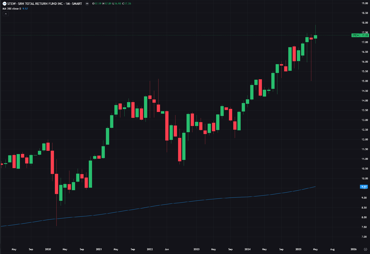 Несмотря на свою репутацию, не все фонды закрытого типа гонятся за высокой дивидендной доходностью. Да, в подобных постах я пытаюсь находить стоимостные варианты с высокой доходностью для диверсификации, но также важно распознавать другие фонды, которые существуют. Некоторые, такие как SRH Total Return Fund ($STEW), преследуют довольно простую цель и очень похожи на традиционные фонды акций. В случае $STEW он нацелен на качественные компании, торгующиеся ниже своей внутренней стоимости, а его график сильно коррелирует с $SPX.