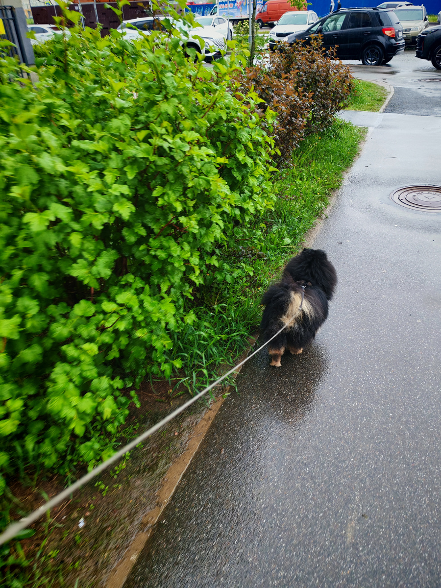 06.10 Выходим гулять с собакой. Сегодня на улице дождливо, +9°. Собака жизнерадостно бегает вдоль дорожки, бодро шлепая по лужам. Она оптимистка, всегда хорошее настроение.