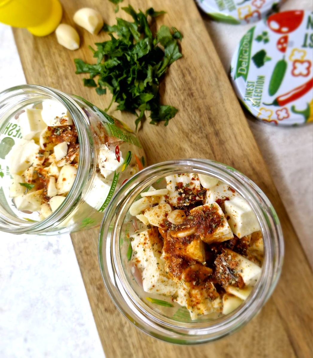 Сырная закуска из адыгейского сыра – это идеальное дополнение к бокалу любимого вина. Адыгейский сыр, с его нежным и слегка солоноватым вкусом, прекрасно впитывает ароматы специй и трав. Данный рецепт прекрасен еще и тем, что на выходе вы получаете не только вкусную пикантную закуску, но еще и ароматное, насыщенное масло, которое идеально подойдет для заправки салатов или же для обмакивания свежего хлеба или хрустящих крекеров. Для приготовления сырной закуски возьмем: Смешивать и хранить такую сырную закуску лучше в стеклянной емкости с крышкой. Я взяла и разделила ее на 2 стеклянные баночки. Сыр нарезаем кубиками, чеснок кружочками, петрушку измельчаем. На дно каждой баночки выкладываем часть сыра, чеснок, петрушку, всё это засыпаем специями и заливаем медом, соком лимона и маслом. Я добавила еще пару-тройку листиков свежесобранного базилика. Баночки закрываем крышками и убираем в холодильник минимум на ночь. Всё, ароматная и пикантная закуска готова! Такой сыр, также как и масло,