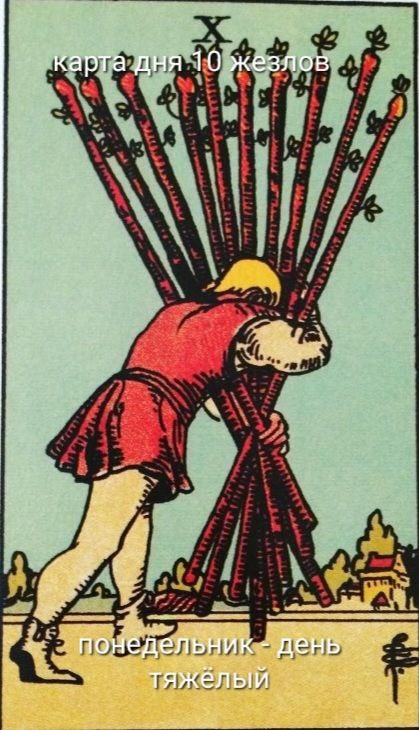 Карта дня 10 жезлов Понедельник - день тяжёлый, это точно про сегодня. Верьте в себя! Всё получится! Но по чуть-чуть и возможно не с первого раза. Лучше сегодня умерить пыл и завышенные ожидания. Все дела, начатые сегодня, получатся при должном старании, а при неудаче не стоит сдаваться, надо пробовать ещё. День не простой, но благоприятный. Возможен стресс, особенно на работе, но если изначально понимать, что придётся сделать несколько попыток, прежде чем получится, то переживания будут менее болезненными.