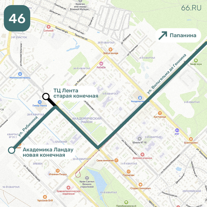 С 26 мая маршруты изменили автобусы № 46, 50 и 55. «Это позволит использовать общественный транспорт большему количеству людей и сократит интервал подъезда автобусов к самым загруженным остановкам», — говорится в официальном сообщении мэрии. Это первые результаты работы по изменению маршрутной сети города. В августе, с заключением брутто-контрактов, будут очередные корректировки, ранее сообщали 66.RU в пресс-службе администрации Екатеринбурга. Маршрут продлили по улице Рябинина. Ввели остановки «Патрушиха», «Академика Ландау». При движении в сторону улицы Папанина теперь нет остановки у торгового центра «Лента». Автобус продлили по новому участку улицы Хрустальногорской — улицы Феофанова до Широкой Речки. Ввели остановки «Архитектора Белянкина», «Евгения Савкова», «Широкая Речка». Тоже продлили до Широкой Речки. Новая конечная теперь на остановке «Мичуринский (Сады)». Ранее сообщалось, что с 1 июня поменяются маршруты девяти автобусов. Кроме вышеперечисленных, это № 40, 43, 83, 59, 67,