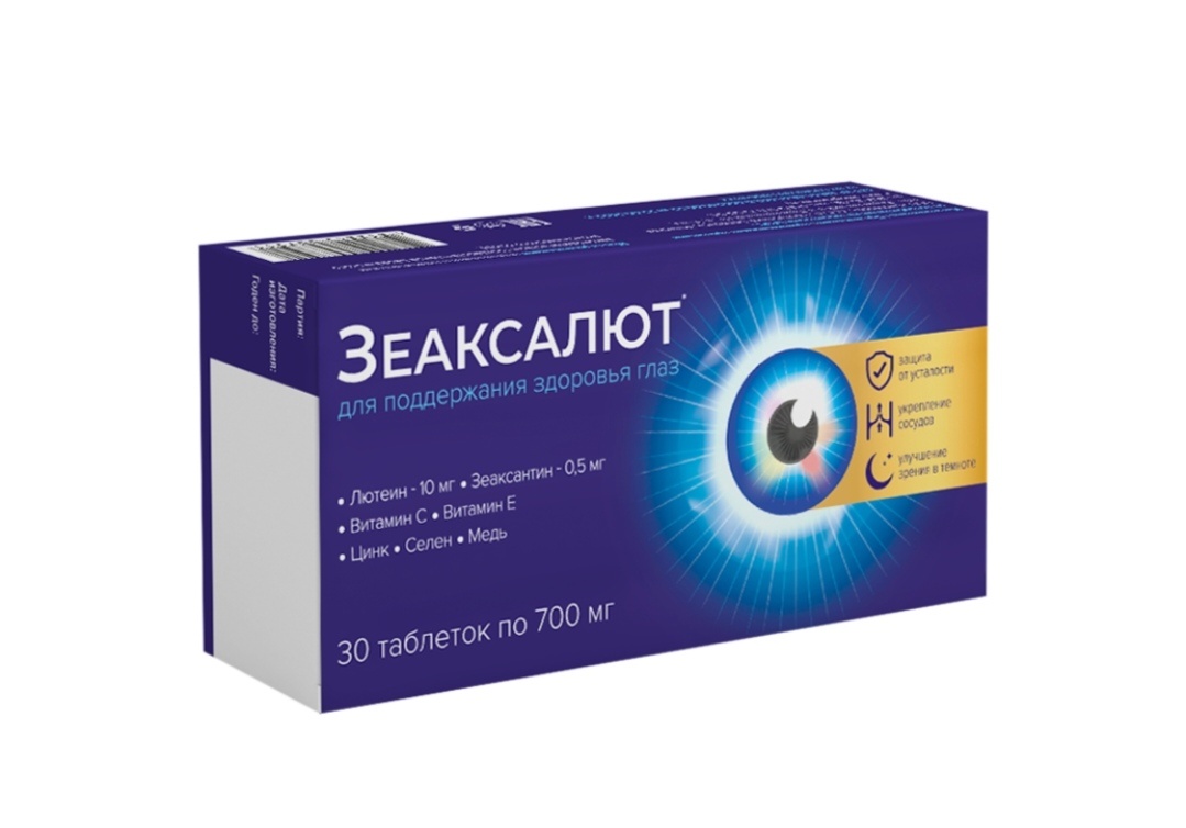Зеаксалют биодобавка к пище Если верить производителя, каждая таблетка препарата содержит натуральный лютеин в количестве 10 по и 0,5 мг зеаксантина: каратиноидов, необходимых для острого зрения. БАДы с такой дозировкой элементов в наших аптеках почти не встречаются. Дополнительно в таблетках есть медь, витамины С и Е, цинк и селен в количестве от 100 до 200% суточных норм. Это, кстати, тот состав, который подтвержден офтальмологическими исследованиями как наиболее оптимальный для лечения многих хронических болезней глаз. Способствует снижению синдрома усталости глаз (ухудшение фокусировки, жжение, сухость, ощущение инородного тела и слезотечение), риска развития возрастной макулярной дистрофии, снятию напряжения с глаз и сохранению зрения, защите глаз от усталости и раздражения, улучшению адаптации зрения в темноте и укреплению стенок кровеносных сосудов, в том числе сосудов глазного дна, положительному влиянию на функциональное состояние органов зрения, связанное с дефицитом витамино