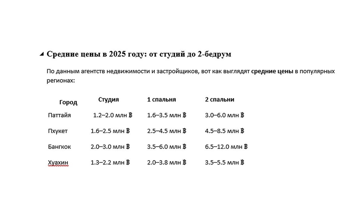 «Купить квартиру у моря — звучит как мечта. Но в Таиланде она всё ещё реальна… если знать, где искать.» Недвижимость в Таиланде снова на волне интереса. Кто-то планирует переезд, кто-то — зимовку, а кто-то — выгодную инвестицию. В 2025 году рынок снова оживился: спрос растёт, а вместе с ним — и цены. Особенно в популярных локациях, таких как Паттайя, Пхукет и Бангкок. Сколько стоит студия с видом на море? Где ещё можно найти разумные цены? А какие районы уже вышли за пределы «доступного»? Давайте разложим всё по полочкам — по цифрам, без воды. По данным агентства My Thai Home, Паттайя по-прежнему остаётся самым доступным крупным курортом. Мы следим за динамикой и помогаем нашим клиентам подобрать подходящий район и бюджет. Если говорить простым языком, картина такая: Паттайя — самый доступный вариант. Особенно если смотреть Джомтьен и Восточную часть города.