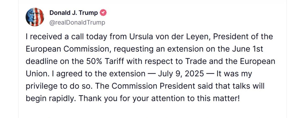 🔥🇺🇸🇪🇺 Трамп отложил введение повышенных пошлин на товары из ЕС до 9 июля