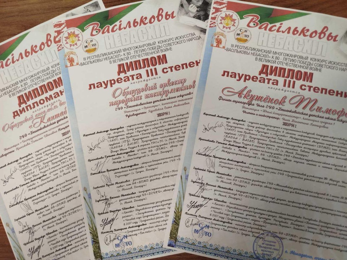 🎼Наши юные музыканты стали дипломантами III Республиканского многожанрового конкурса искусства «Васільковы небасхіл», приуроченного к 80-летию Великой Победы 🎵Проводился конкурс в дистанционном формате. Участие в мероприятии приняли 372 конкурсанта из Беларуси, России и Турции, в том числе и представители Бешенковичской детской школы искусств, которые отмечены тремя Дипломами. 🎶Так, образцовый оркестр народных инструментов под руководством Елены Ядревской в номинации «Оркестры» награжден Дипломом лауреата III степени. 🎶В номинации «Юный концертмейстер» Диплома лауреата III степени удостоен учащийся филиала агрогородка Улла Тимофей Акутенок, который занимается в классе учителя Валентины Ушал. 🎶Дипломантом конкурса стал образцовый ансамбль виолончелистов «Кантабиле» под руководством Татьяны Ивановны Красиковой. 👏Поздравляем! Всем творческих успехов и новых побед!