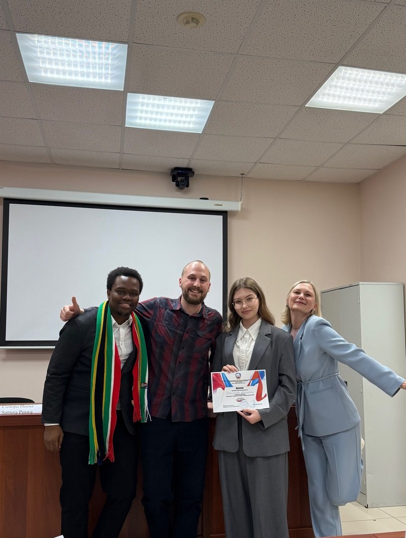 🏆 Конкурс переводчиков: яркие моменты и победа нашей студентки! В нашем университете состоялся долгожданный и очень важный ежегодный конкурс профессиональных переводчиков. Это событие собирает лучших студентов, которые демонстрируют свои навыки в переводе диалогов на актуальные юридические темы. 🔹 Особые гости: ✔ Самора Посва (гражданин ЮАР), который зарядил атмосферу энергией и харизмой. ✔ Михаил Бродский (эксперт в международных отношениях, представитель офиса Почётного консула ЮАР в Екатеринбурге), чье участие подчеркнуло важность международного сотрудничества и профессионализма. 🌟 Наша гордость: Студентка Виолетта Новоселова блестяще проявила себя, завоевав награду в номинации «Лучший русский язык»! Виолетта проявила себя как талантливый специалист, продемонстрировав не только отличное владение русским языком, но и глубокое понимание юридической терминологии. ⚖ БЫТЬ ЛУЧШИМ - ВАШЕ ПРАВО! ⚖