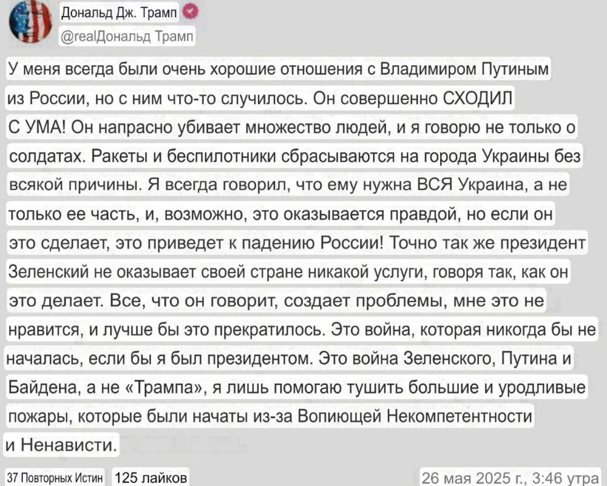 Недовольство у Дональда Трампа вызвал симметричный ответ России на украинские атаки беспилотниками на Москву и российские города. Президент США неожиданно раскритиковал действия Владимира Путина. Последние несколько дней Киев испытывает на себе последствия действий и заявлений Владимира Зеленского, сперва нарушившего предложенное Россией пасхальное перемирие, отказавшегося от прекращения огня в честь Дня Победы и устроившего провокацию на инициированных Россией переговорах в Стамбуле. Атаки украинских БПЛА в последние дни лишь усилились. За налета с утра 25 мая до восьми утра 26 мая над российскими регионами сбито 148 украинских БпЛА самолетного типа, сообщило Министерство обороны РФ. Ответ не заставил себя ждать — в ночь на 25 и 26 мая Минобороны РФ массировано и точно прошлось по Украине различными видами ракет. — В результате массированного налёта «Гераней» и удара крылатых ракет, полностью разрушены цеха завода Антонов в Киеве. Пожар тушат до сих пор. Район метро Святошин оцеплен С