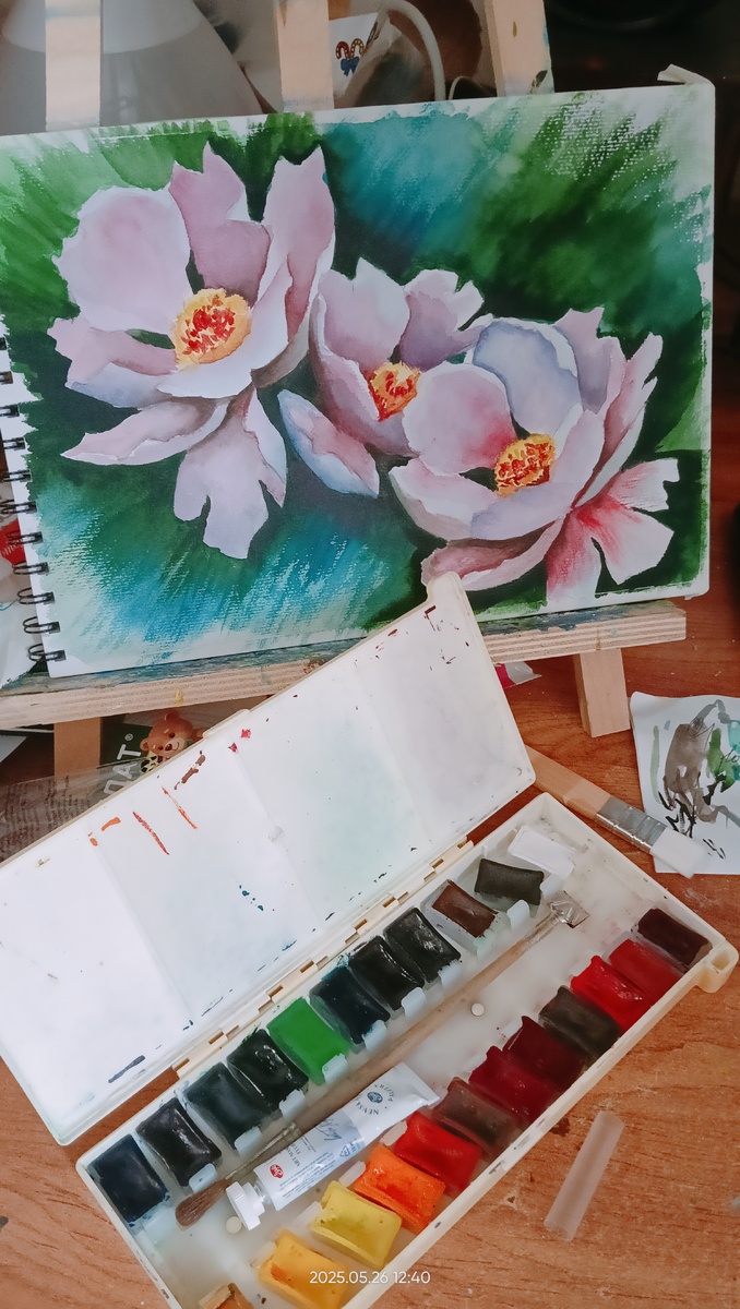 Мне очень нравятся пионы. Давно хотелось их нарисовать. Сегодня расчехлила снова акварель и приступила прямо с утра за работу. Почему акварель, а не акрил? Решила послушать совета одного художника и покинуть зону комфорта. Для меня эта зона - акрил и гуашь. Акварель очень капризна, я с ней на Вы. Но пора бы уже и подружиться. Это китайские пионы, а может древовидные. Если честно, то я не разбираюсь в цветах и особой разницы не знаю)) Кто знает, напишите в комментариях. Работу рисовала при помощи референдум из мастер класса, рисовала сама, мастер классом решила не пользоваться. Так как с акварелью я не очень, то всё советы из МК мне не особо пригодятся))) Рисовала своими способами и методами. Вот итог. Как вам? Немного видно кавардак на рабочем месте, эдакий творческий беспорядок))) Работала в новом скетчбуке, вчера забрала из пункта выдачи и сразу захотелось попробовать. Бумага среднего зерна и плотностью 300, бренд Intelligent, формат А4. Не могу ничего сказать про этот альбом
