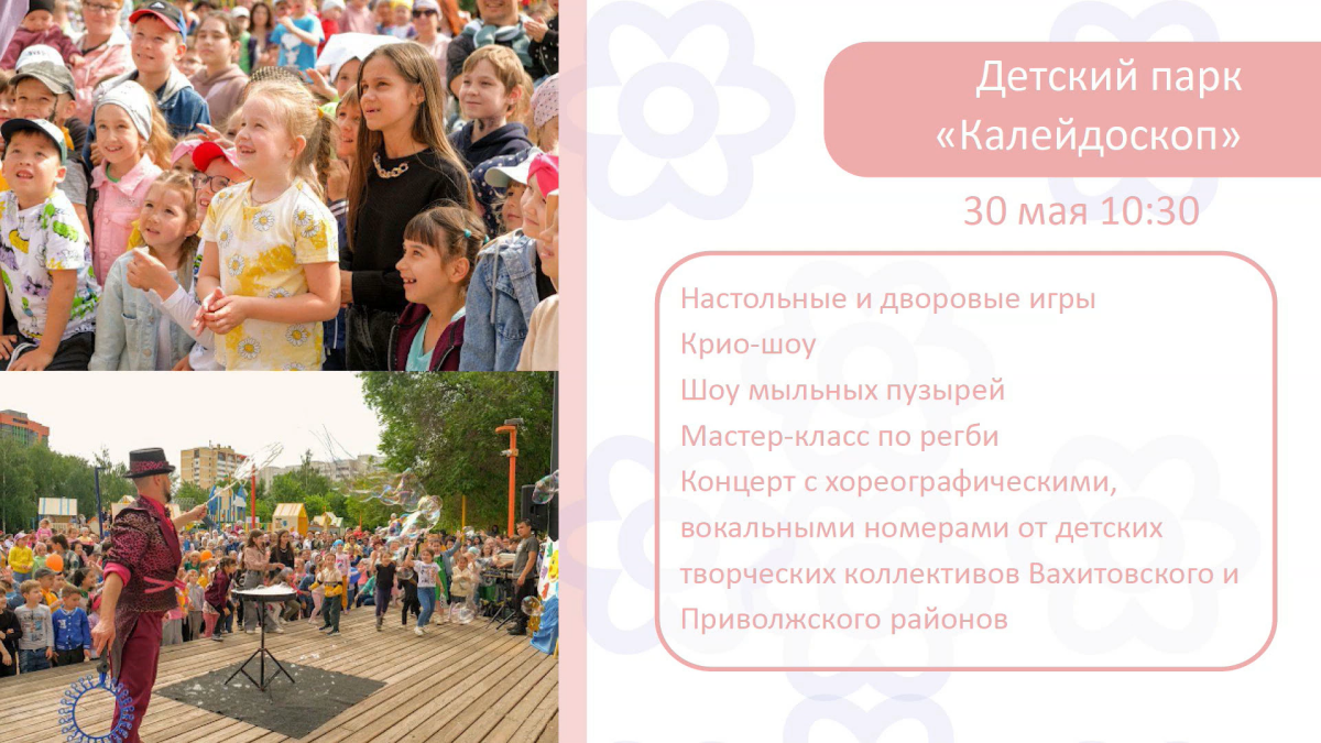 Автор: Александра Давыдова В Казани в честь Международного дня защиты детей пройдет более 100 мероприятий во всех районах города. Они продлятся с 30 мая по 3 июня, сообщила замруководителя исполкома столицы РТ Гузель Сагитова на деловом понедельнике. Мероприятия организуют городские библиотеки, культурные и молодежные центры, подростковые клубы, спортивные учреждения, а также районные администрации. В программе – фестивали, концерты, мастер-классы, игровые зоны, спектакли, спортивные соревнования и экскурсии. Старт празднованию даст районный праздник в детском парке «Калейдоскоп» 30 мая, подготовленный администрациями Вахитовского и Приволжского районов. Для детей организуют творческие мастер-классы, дворовые и настольные игры, криошоу, конкурсы и концерт с участием детских коллективов. В этот же день в сквере Аксенова планируются музыкальные выступления воспитанников школы №18 имени Мансура Музафарова. 31 мая в Горкинско-Ометьевском лесу пройдет фестиваль «Дорогою добра» для детей с о
