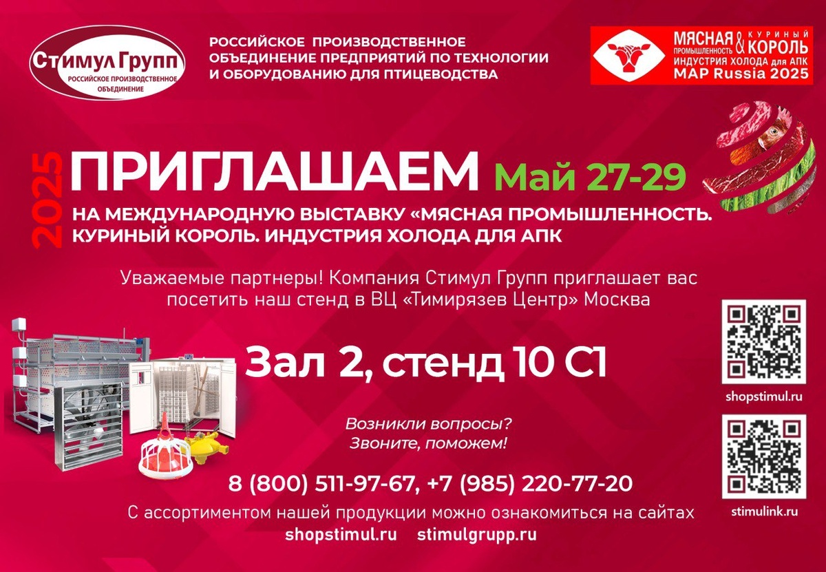 Очень скоро состоится Международная выставка Куриный Король 2025! Приглашаем вас на наш стенд 10С1 в ВЦ «Тимирязев Центр» Москва, зал 2 (Вавилов). На нашем стенде вы сможете ознакомиться с передовыми технологиями в таких направлениях, как инкубация, клеточное содержание с-х птицы, напольное содержание при разведении различных видов с-х птицы, оборудование для кормления, поддержания микроклимата, автоматизации всех этапов производства яйца и мяса птицы. Мы ждем вас с 27-29 мая 2025 с 10:00-18:00 в ВЦ «Тимирязев Центр» Москва, зал 2, стенд 10С1 Адрес: Москва, Верхняя аллея, 8 Станция метро «Петровско-Разумовская»