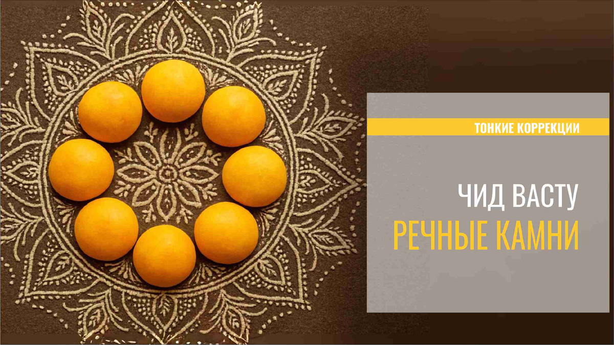 Речные камни – естественный природный артефакт. Валуны, обкатанные водой, представляют собой настоящие сгустки энергии, заряженные силой пяти первоэлементов. Утяжеление зон оттока речными камнями - одна из самых простых, доступных и эффективных Васту-коррекций. Для усиления действия камни обычно окрашивают в соответствующие зоне цвета – жёлтый для южных секторов, и синий для западной зоны. Коррекция речными камнями рекомендована, если в оттоке есть расширение или вырез, входная дверь, окна, туалет в углу, много свободного пространства и т.п. Камни в рекомендованных пропорциях следует заложить в стяжку пола при ремонте, или разложить на полу. Чтобы коррекция не бросалась в глаза, камни можно положить в напольные вазы, цветочные кашпо, под тумбы, комоды и т.п. Так же полезно делать облицовку речными камнями стен в зонах оттока. В книге доктора Сахасрабуддхе «Тантра Васту», есть интересный способ коррекции для участка девятью круглыми речными камнями, окрашенными в жёлтый или шафрановый ц