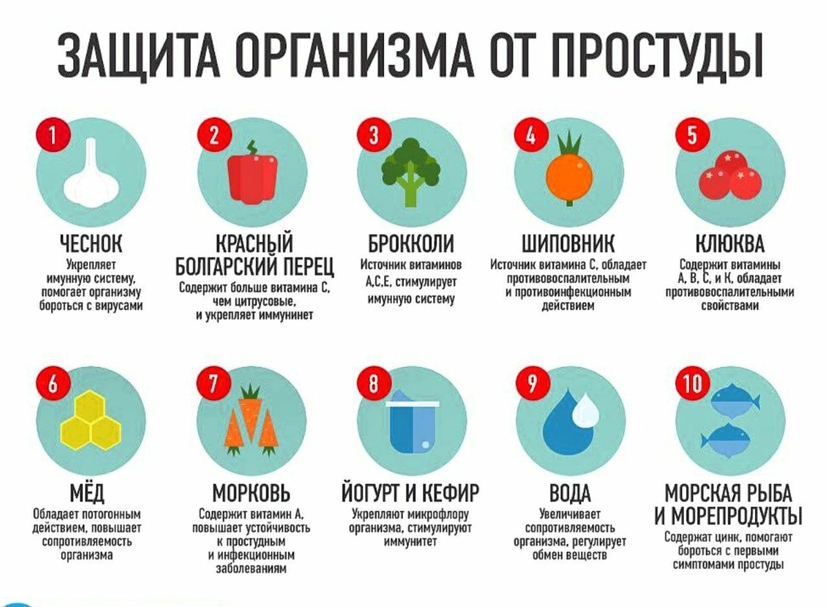 При высокой температуре: Жаропонижающие средства (парацетамол, ибупрофен) при температуре выше 38.5°C (для взрослых) или при плохом самочувствии. - Сбалансированное питание: Легкая, легкоусвояемая пища, богатая витаминами (особенно С и D) и минералами.