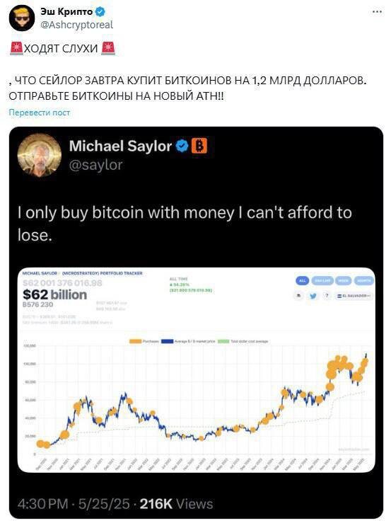 ⚡️Сэйлор Готовится к Новой Покупке Биткоина на $1,2 млрд Вчера в воскресенье Сэйлор как всегда выложил скриншот своего сайта намекая о предстоящей покупке сегодня, ведь в последние месяцы он покупает именно по понедельникам. 😯Ходят слухи, что Сэйлор может купить BTC на сумму $1,2 млрд, что может отразится на цене. 📈Плюс к этому сегодня фонды также могут продолжить накапливать через ETF. Поэтому будем наблюдать за движением цены BTC.