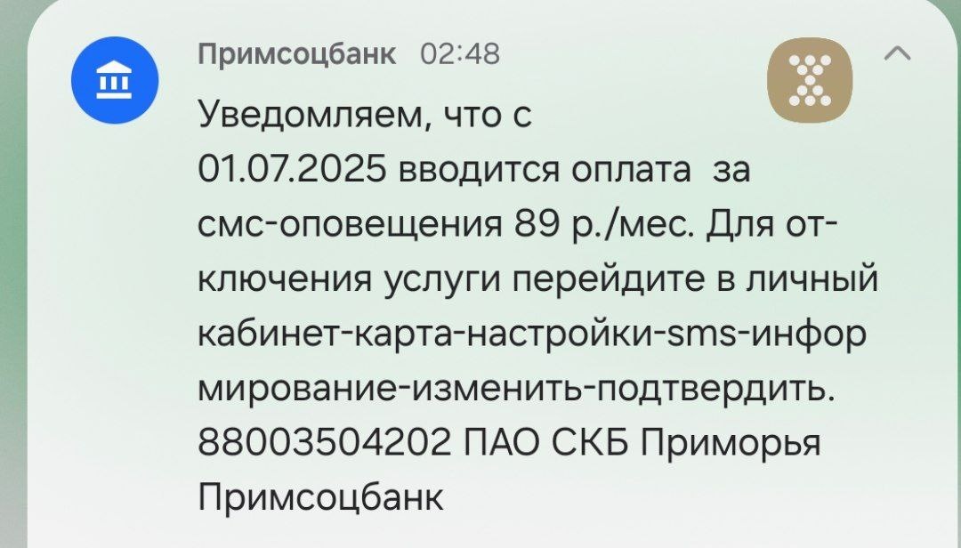 Примсоцбанк разослал уведомление, что с 1 июля вводит плату за СМС. И заодно рассказывает, как уведомления отключить.