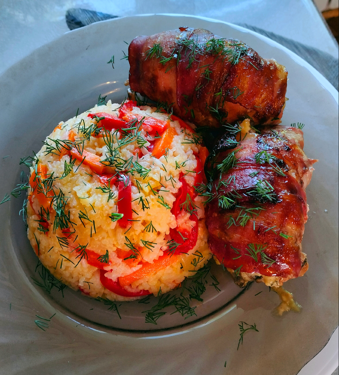 1. Свиная корейка - 1200 гр. 2. Бекон - 150 гр. 3. Шампиньоны - 250 гр. 4. Плавленый сыр - 150 гр. 5. Сливочное масло - 40 гр. 6. Соус терияки (для смазывания) 7. Зелень (лук и укроп) 8. Майонез 2 ст/л. 1. Соль. 2. Перец черный молотый. 3. Паприка копчёная. 🥩 Свиной окорок промыть, обсушить бумажным полотенцем и нарезать стейки толщиной 1 см; 🥩 Стейки хорошо отбить с двух сторон до тоненького пласта, посолить/поперчить; 🥩 Шампиньоны нарезать мелкими кубиками и обжарить на сливочном масле до испарения жидкости, обжаривать 20 секунд; 🥩 Натереть на мелкой тёрке плавленый сыр, добавить шампиньоны и зелень. Две ложки майонеза, хорошо перемешать; 🥩 На стейки выложить начинку тонким слоем, свернуть в рулет и обернуть в одном кусочке бекона; 🥩 Положить на противень помазать соус терияки и убрать в духовку на 180 градусов на 30 минут.