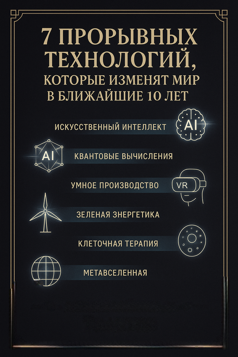 Будущее — уже не за горами. В течение ближайших 10 лет человечество столкнётся с технологическими изменениями, которые можно сравнить по масштабу с изобретением электричества или интернета. Некоторые разработки сегодня ещё кажутся экспериментальными, но уже завтра они могут стать частью повседневной жизни. Вот 7 технологий, которые, по мнению учёных и аналитиков, кардинально повлияют на мир до 2035 года. --- Современный ИИ умеет писать тексты, генерировать изображения и распознавать речь. Но это только начало. Уже в ближайшие годы мы увидим ИИ нового уровня — способный к абстрактному мышлению, принятию решений, и даже научным открытиям. Что изменится? Врач ИИ будет ставить диагноз точнее человека; Учителя-боты смогут подстраиваться под индивидуальный стиль каждого ученика; Автоматизация затронет не только физический, но и умственный труд. Риски: безработица среди "белых воротничков", этические конфликты, проблемы управления сознанием ИИ. --- Они не заменят обычные комп