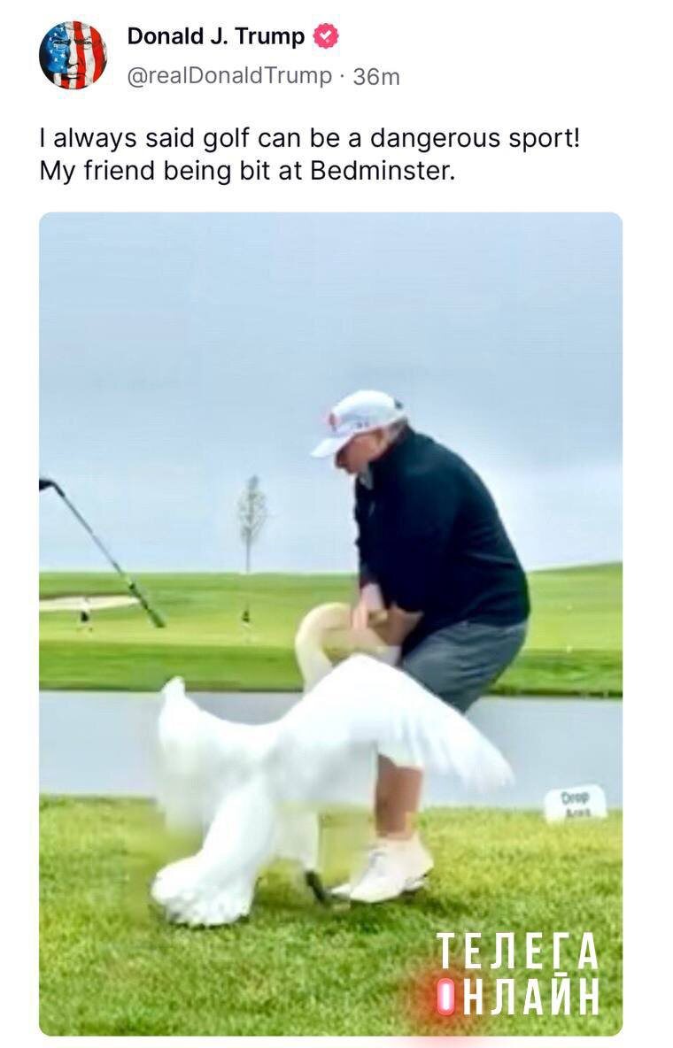 Экстрим, который они заслужили Дональд Трамп пожаловался на трудности выходных: Я всегда говорил, что гольф может быть опасным спортом! Моего друга укусили в Бедминстере. В СМИ предполагают, что пострадавшим может быть спецпосланник президента США, неоднократно посещавший Москву, Уиткофф. Как бы теперь лебедя в работе на Кремль не обвинили. 🚲 Подпишись на Телега Online