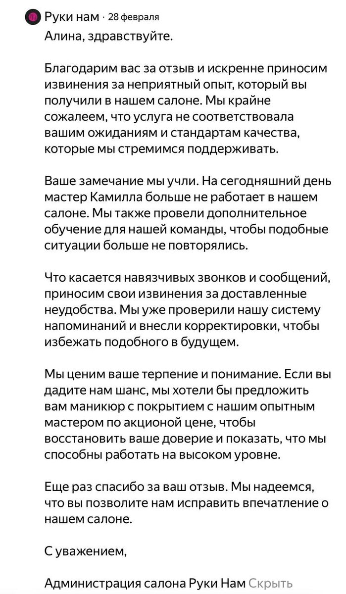 Положительные отзывы это пожалуй одно из самых главных условий привлечения клиентов с геосервисов. Если вы решите запускать контекстную рекламу или оплачивать подписку Яндекс бизнеса, то позаботьтесь о том, чтобы количество отзывов было минимум трехзначным, а средняя оценка на карточке организации была 5 звёзд. Отзывов много не бывает. Однажды нам удалось за месяц собрать около 100 положительных отзывов на Яндексе. Задача это конечно не легкая, но точно выполнимая. После того как отзывы собраны, не менее важно на них ответить. При ответе на отзывы важно придерживаться вежливого и профессионального тона. Не нужно отвечать на отзывы в стиле: «мы тоже рады, что вы к нам больше не придёте» или «Вы ногти свои видели? Скажите спасибо, что мы вас вообще приняли». Вот основные схемы ответов на отзывы, которыми пользуемся мы: 1. Ответ на положительный отзыв - Благодарность. - Подтверждение радости от хорошего опыта клиента. - Приглашение посетить снова. 2. Ответ на нейтральный