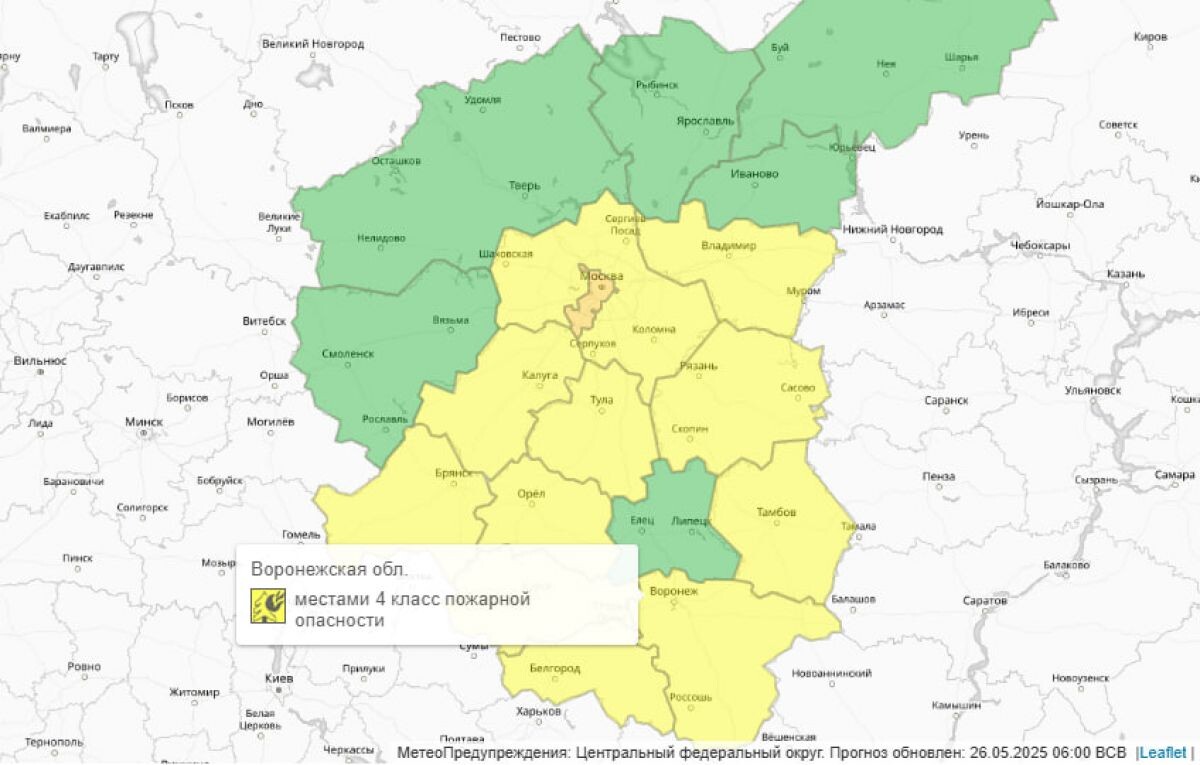 Воронежская область продолжает находится в зоне действия желтого уровня погодной опасности. Об этом стало известно из прогностической карты предупреждений ЦФО. А все из-за того, что местами на территории региона продолжает действовать четвертый класс пожарной опасности. Согласно последним данным, соответствующее предупреждение продержится до 06:00 27 мая. Напомним, ранее в Воронежской области на два дня установили 4 класс пожарной опасности. Тогда четвертый класс пожарной опасности установили в регионе до 6 часов утра 26 мая.