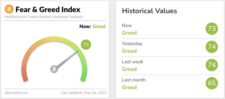 Индекс страха и жадности криптовалюты составляет 73... Жадность сохраняется