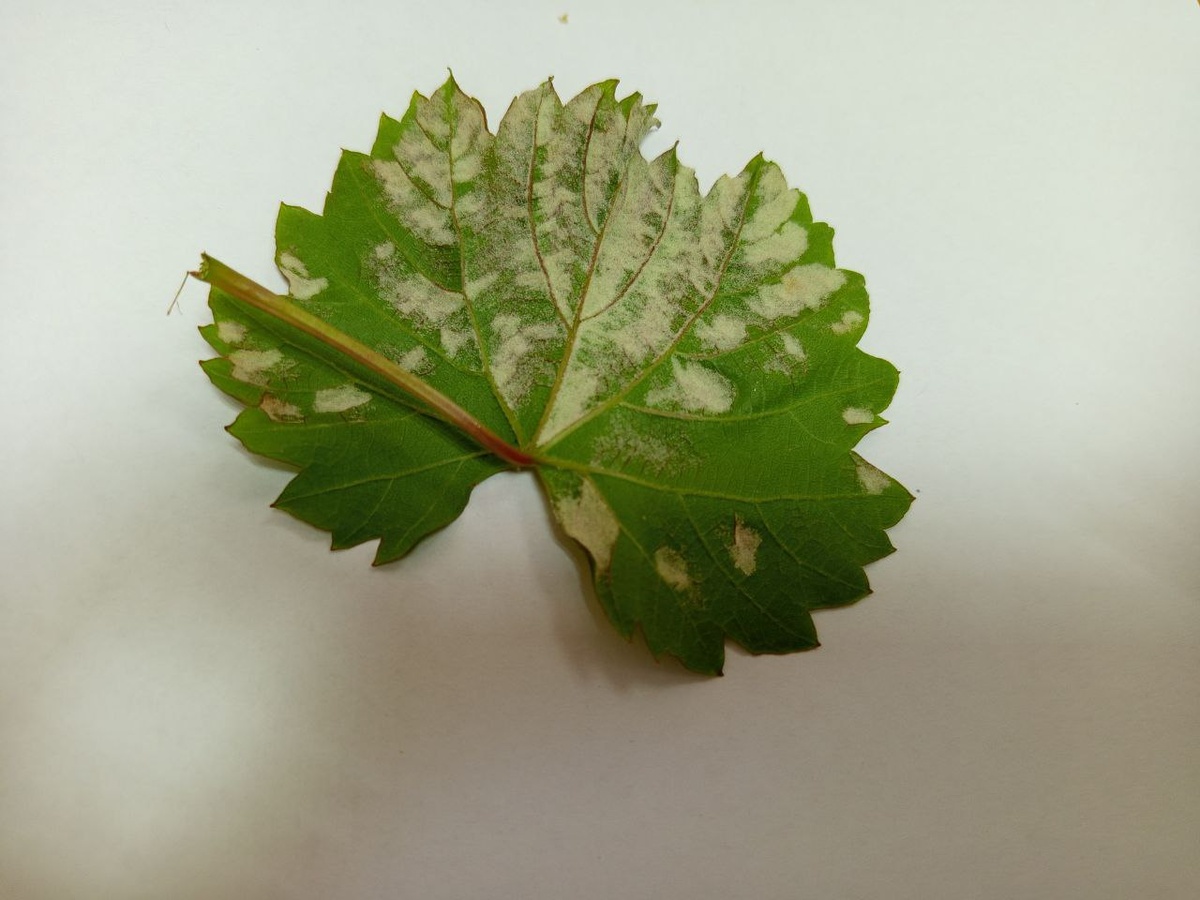 Во-первых, для начала нужно точно удостовериться, что у вас на винограде завёлся клещ. Этот паразит опасен, он высасывает соки из растения, из-за чего остаются белые пятна на обратной стороне листа, а на его поверхности появляется бугристость.