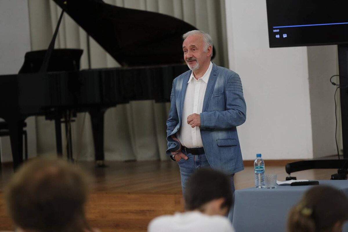 ТВОРЧЕСКАЯ ВСТРЕЧА С КОМПОЗИТОРОМ ВАЛЕНТИНОМ ОВСЯННИКОВЫМ 25 мая в Венедиктовском зале театра состоялась творческая встреча "Рождение музыки". Нашим гостем стал заслуженный работник культуры РФ, композитор, художественный руководитель Московского детского театра эстрады Валентин Валентинович Овсянников. Уникальная творческая встреча организована с целью познакомить участников с процессом создания музыкальных произведений непосредственно устами композитора. Мероприятие призвано вызвать интерес к музыке, раскрыть ее сущность и показать как рождаются звуки, которые превращаются в любимые миллионами мелодии. В ходе встречи Валентин Валентинович поделился с участниками своими секретами, рассказал откуда черпает вдохновение, как выбирает определенные музыкальные формы и стили, совершенствует свое мастерство. Мероприятие состоялось в рамках программы "Правнуки Победы" федерального проекта «Международные культурные центры», проводимого Ассоциацией Музыкальных Театров России, при поддержке М