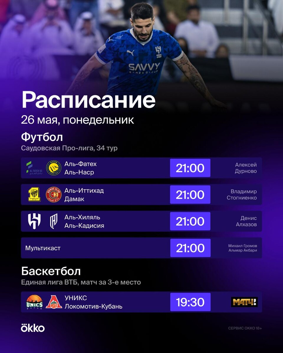 Последний тур саудовской Про-лиги и матч за третье место в Единой лиге ВТБ. Делимся расписанием трансляций на сегодня 🤩